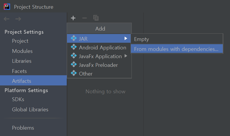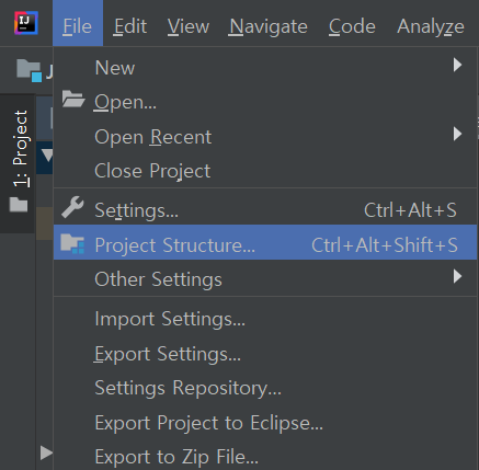 ๋ชจ๋์ ์ ํํ๊ณ (์ฌ๊ธฐ์๋ JarExample) File - Project Structure ๋ฉ๋ด (๋จ์ถํค : Ctrl + Alt + Shift + S) ํด๋ฆญ