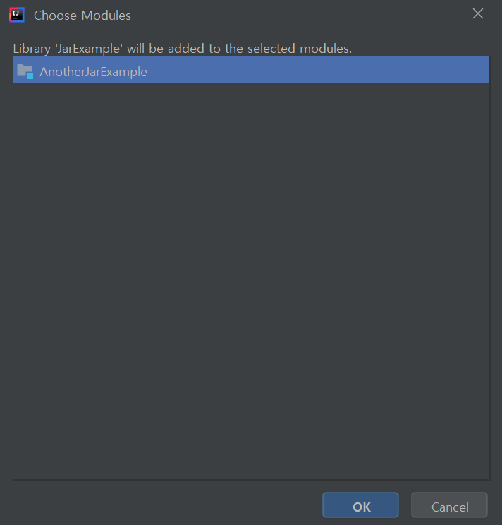 JAR ํ์ผ์ importํ ๋ชจ๋์ ์ ํํ๊ณ OK๋ฅผ ํด๋ฆญํ๋ค. ์ด ์์ ํ๋ก์ ํธ์๋ AnotherJarExample ๋ชจ๋ ํ๋๋ง ์๋ ์ํ์ด๋ค.