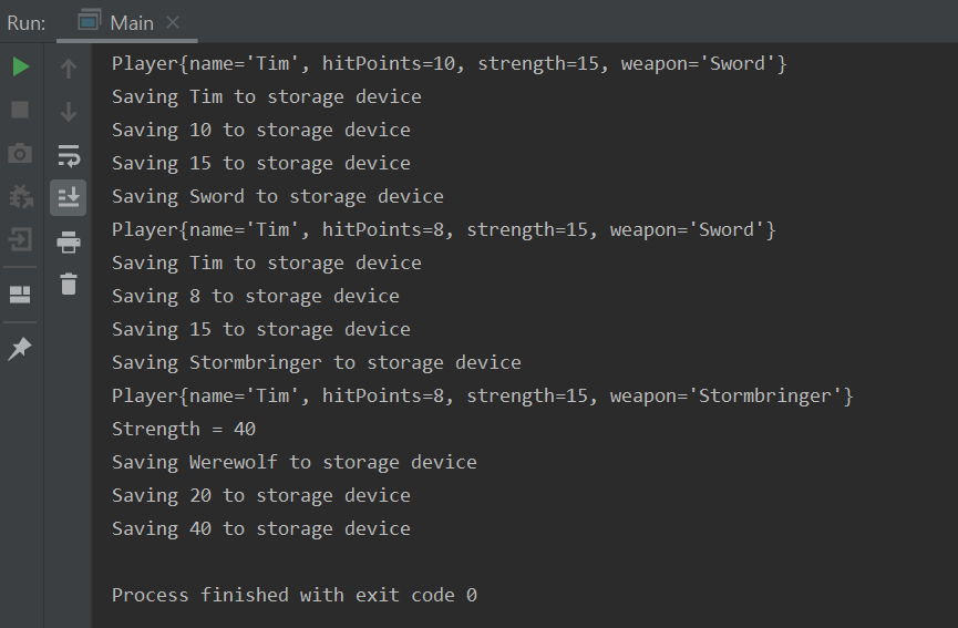 Player{name='Tim', hitPoints=8, strength=15, weapon='Stormbringer'}