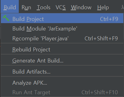 ๊ทธ๋ฌ๋ฉด IntelliJ ์ฐฝ ๊ฐ์ด๋ฐ์ Build Artifact ์๋ธ ๋ฉ๋ด๊ฐ ๋ฌ๋ค. JarExample:jar - Build๋ฅผ ํด๋ฆญํ๋ค.