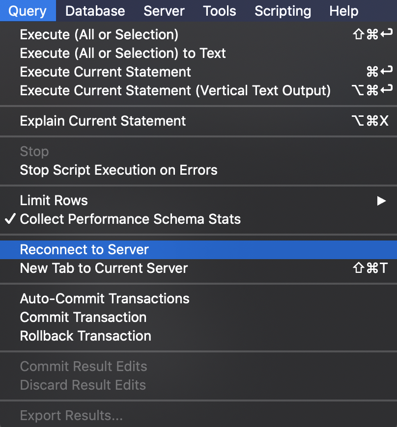 MySQL Workbench > Query > Reconnect to Server๋ก ์๋ฒ์ ์ฌ์ฐ๊ฒฐํด์ ์ฌ์ฉํ๋ฉด ๋๋ค.