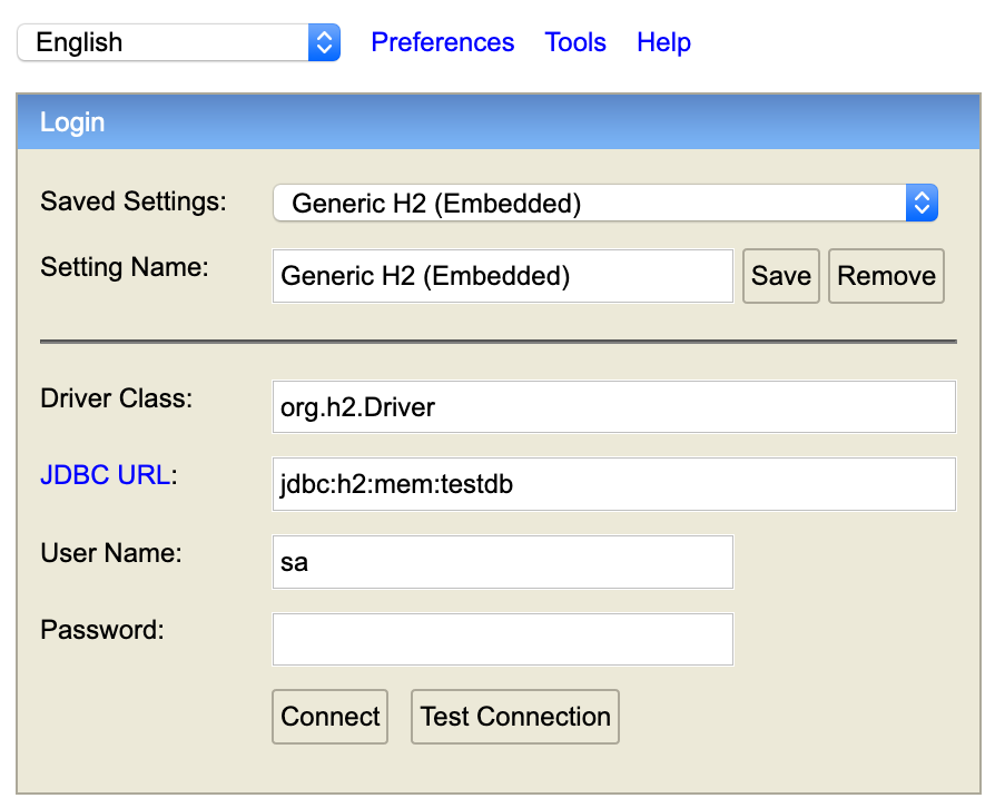 INFO --- [ main] TestRunner : Url: jdbc:h2:mem:testdb