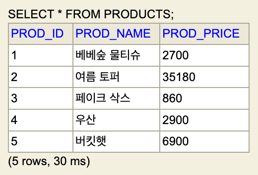 TRACE 956 --- [ main] c.a.m.r.ProductMapper.selectAllProducts : <== Row: 5, ๋ฒํทํ, 6900