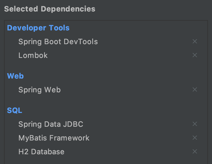 ์๋ฐ๋ 8๋ก, ์์กด์ฑ์ Spring Web, Spring Data JDBC, Spring Boot DevTools, MyBatis, H2, Lombok์ ๋ฃ์ด์ฃผ์๋ค.
