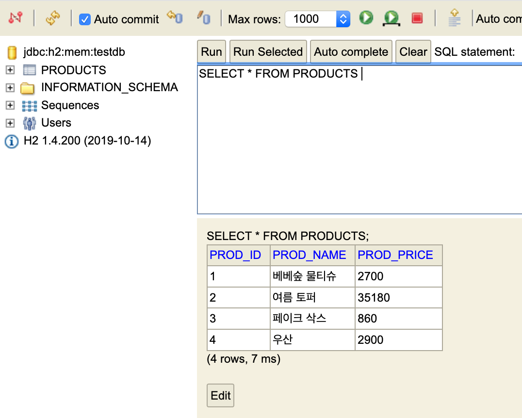 jdbcTemplate.execute("INSERT INTO Products (prod_name, prod_price) values ('๋ฒํทํ', 6900)");